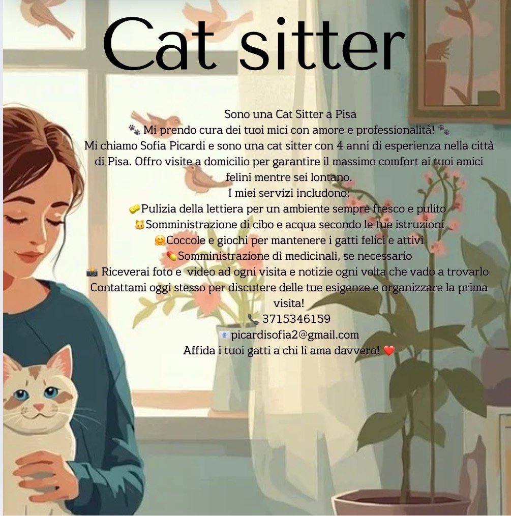 Sono una ragazza di Pisa con quattro anni di esperienza e offro il mio servizio come cat sitter durante le vacanze di Natale di Pasqua e di tutte le festività e inoltre anche se avete bisogno di una sitter per motivi lavorativi o altri io sono sempre disponibile